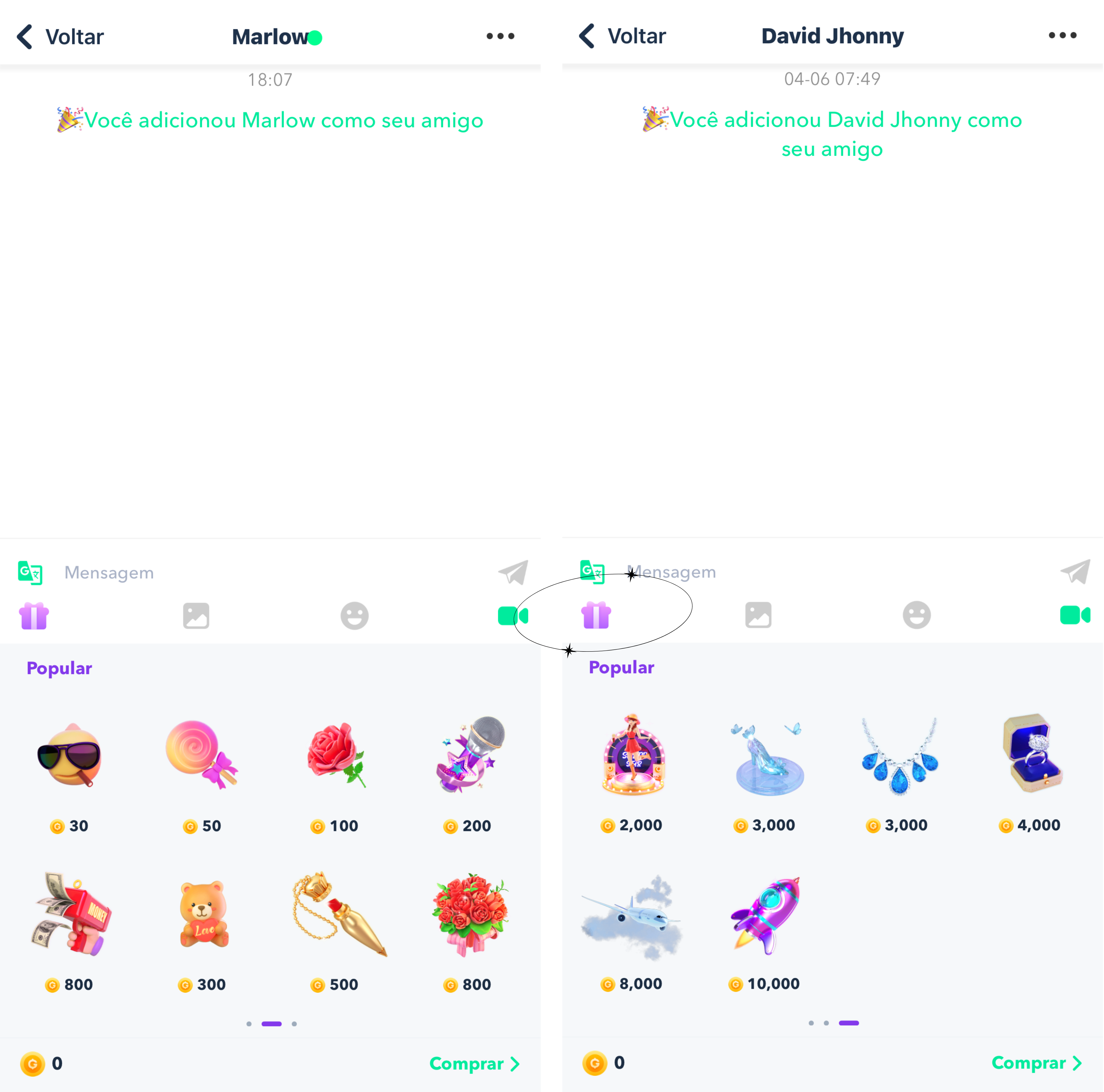 Eles estão localizados tanto durante a chamada quanto no chat escrito. Cada presente possui um valor, do mais baixo ao mais alto, que viram parte do seu salário caso algum usuário te presenteie;