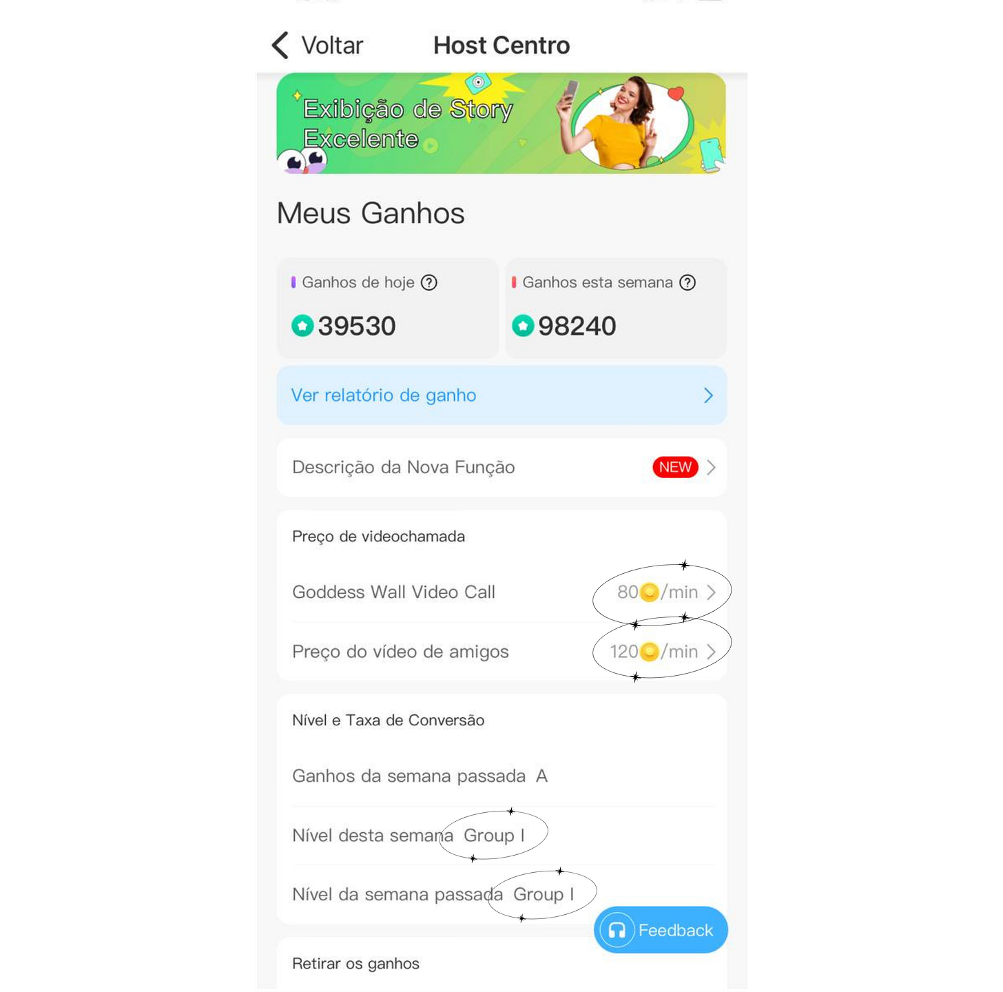 ⑥ Aqui você vê o preço que os usuários estão pagando pra ter uma chamada de vídeo Deusa ou Amigo com você. O valor por minuto é decidido pelo sistema do app, analisando a duração média das suas Chamadas de Amigo – quanto mais longa forem suas chamadas, maior será o preço das suas chamadas. Você inicia com 80 moedas/min, podendo aumentar pra até 120 moedas/min, o que facilita o aumento dos seus ganhos pois você vai estar ganhando mais por tempo de chamada;