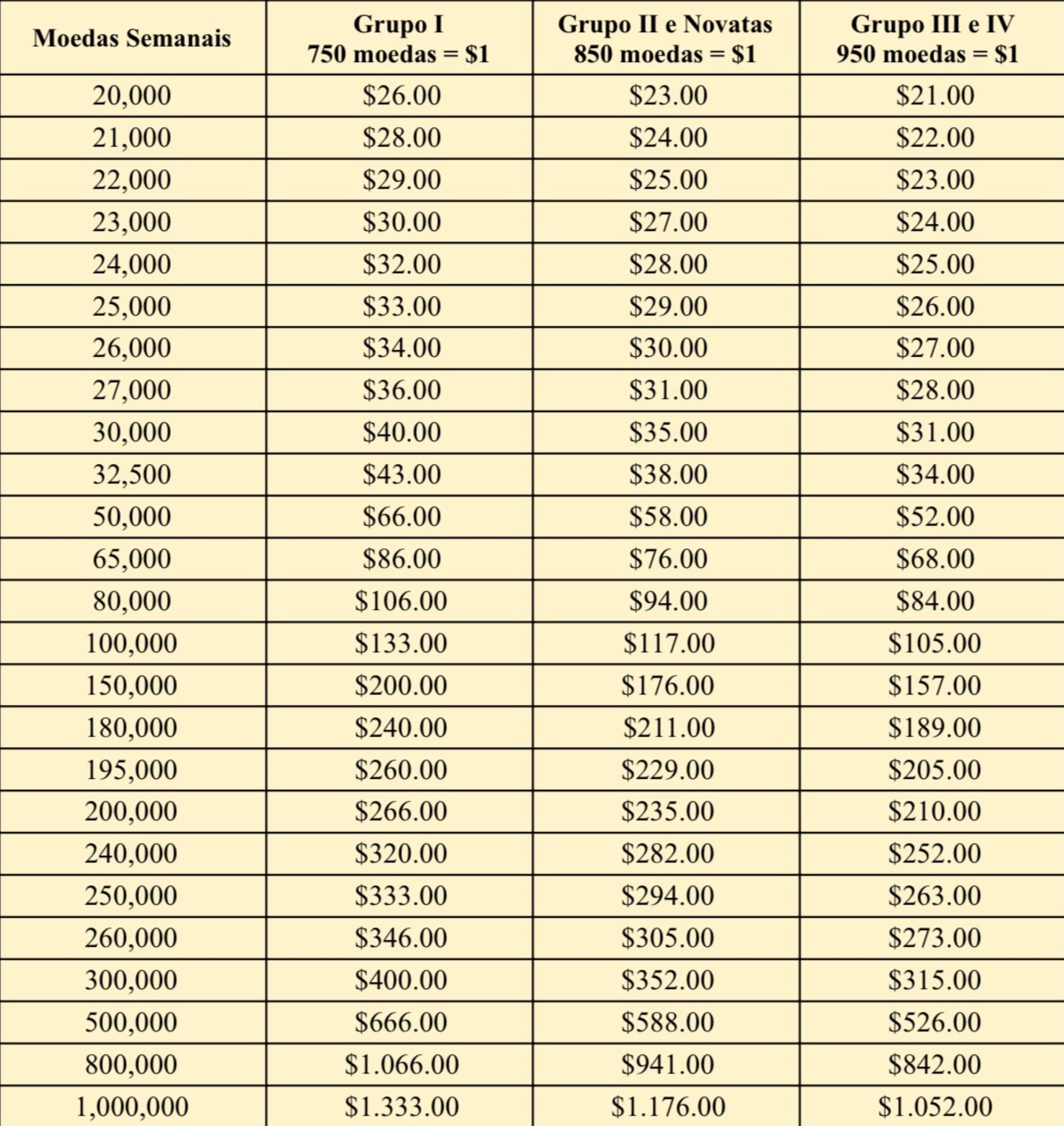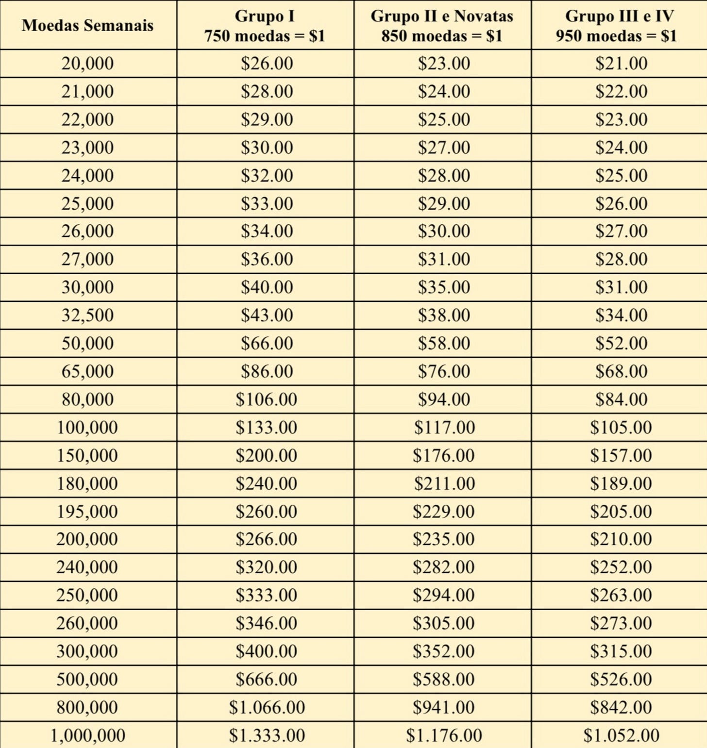 Suas moedas ÷ Valor de conversão do seu nível = Seu salário em dólar (USD)