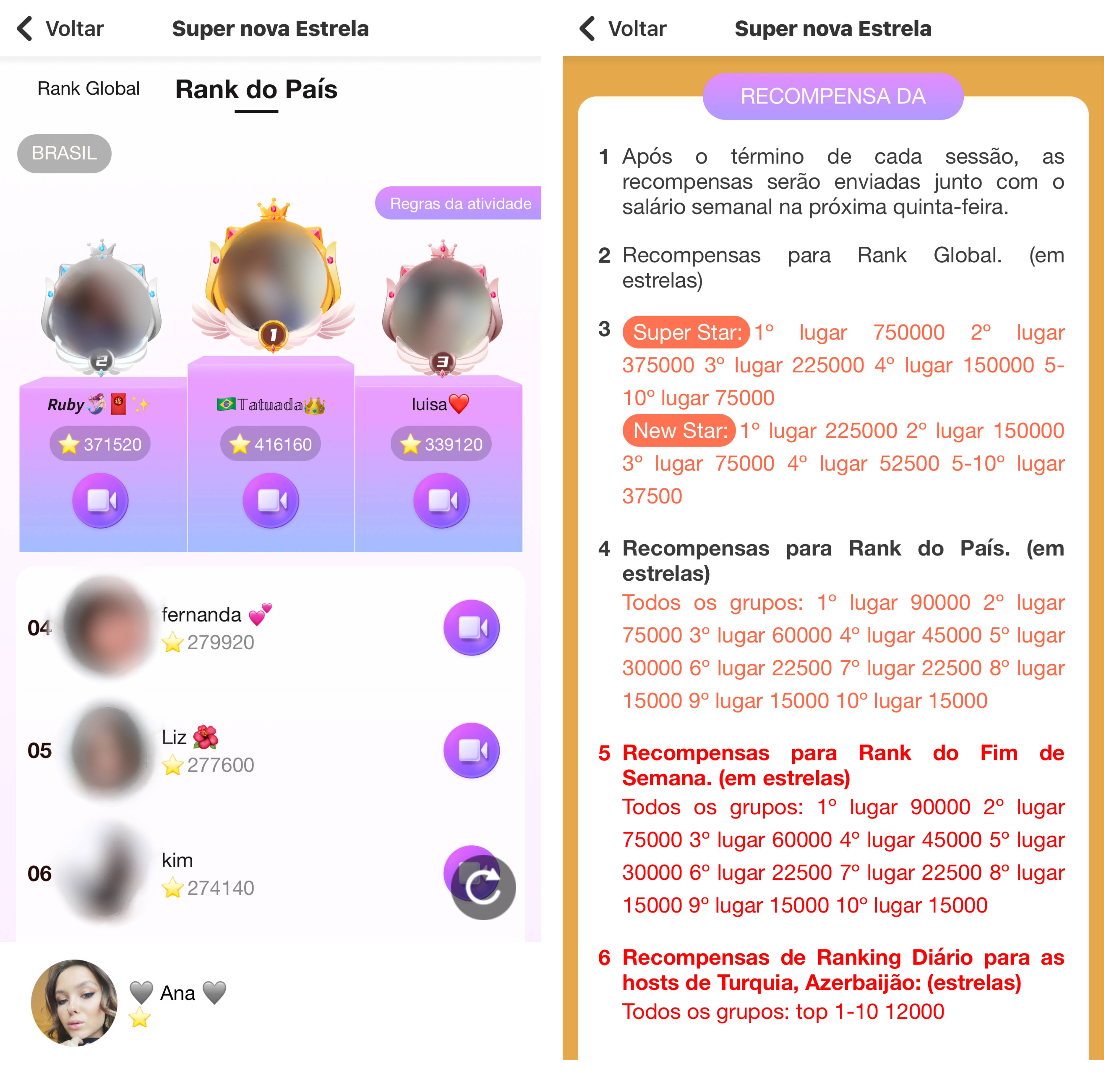É um outro bônus dado pelo app pras hosts que mais fizerem moedas naquela semana. Os rankings são do país (Brasil) e do mundo (Global).